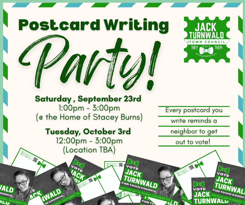 Postcard Writing Party hosted by Stacey Burns (a second party will be 10/3 Location TBA) You can RSVP on the Facebook Event or email me to let me know you'll be attending!